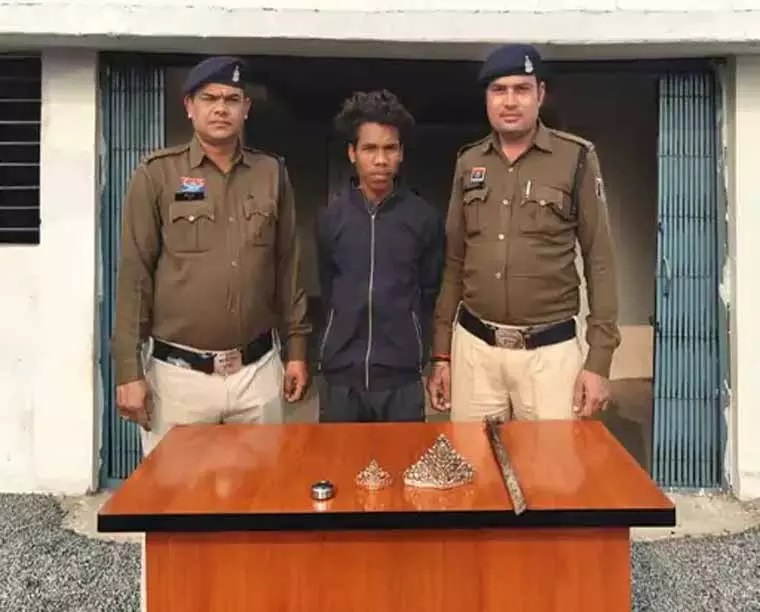 मुखबिरों से मिली सूचना के बाद पुलिस ने घेराबंदी कर आरोपी को हिरासत में लिया। पूछताछ में आरोपी ने अपराध स्वीकार करते हुए बताया कि मोबाइल फोन खरीदने के लिए पैसे न होने के कारण उसने चोरी की योजना बनाई थी। पुलिस ने आरोपी की निशानदेही पर चोरी किए गए दोनों चांदी के मुकुट और चोरी में प्रयुक्त सबल (लोहे की रॉड) भी बरामद कर ली है।